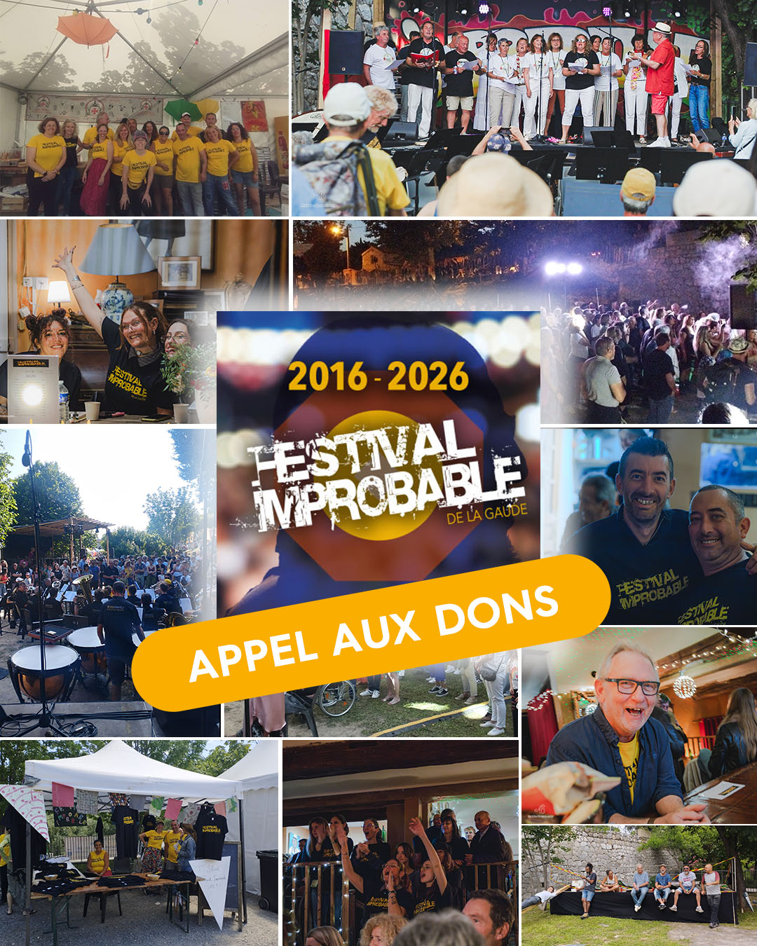 Soutenir le Festival Improbable, c’est investir dans une aventure culturelle profondément ancrée dans son territoire. Depuis 10 ans, ce festival porté par une association engagée et une équipe de bénévoles passionnés fait vivre la musique dans une ambiance conviviale, intergénérationnelle et accessible à tous.Au fil des éditions, l’Improbable est devenu un rendez-vous fédérateur, rassemblant habitants, visiteurs, artistes, partenaires et acteurs économiques autour d’un même élan : faire vivre la culture, créer du lien social et participer au dynamisme local.